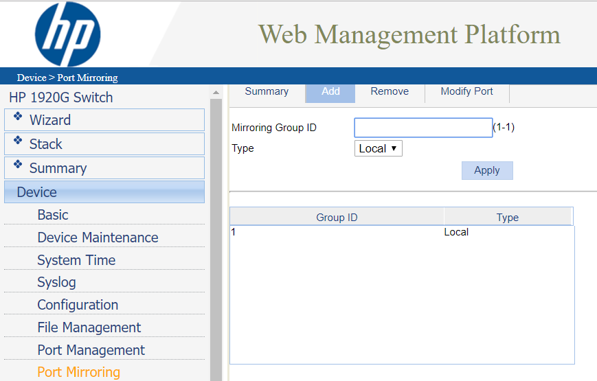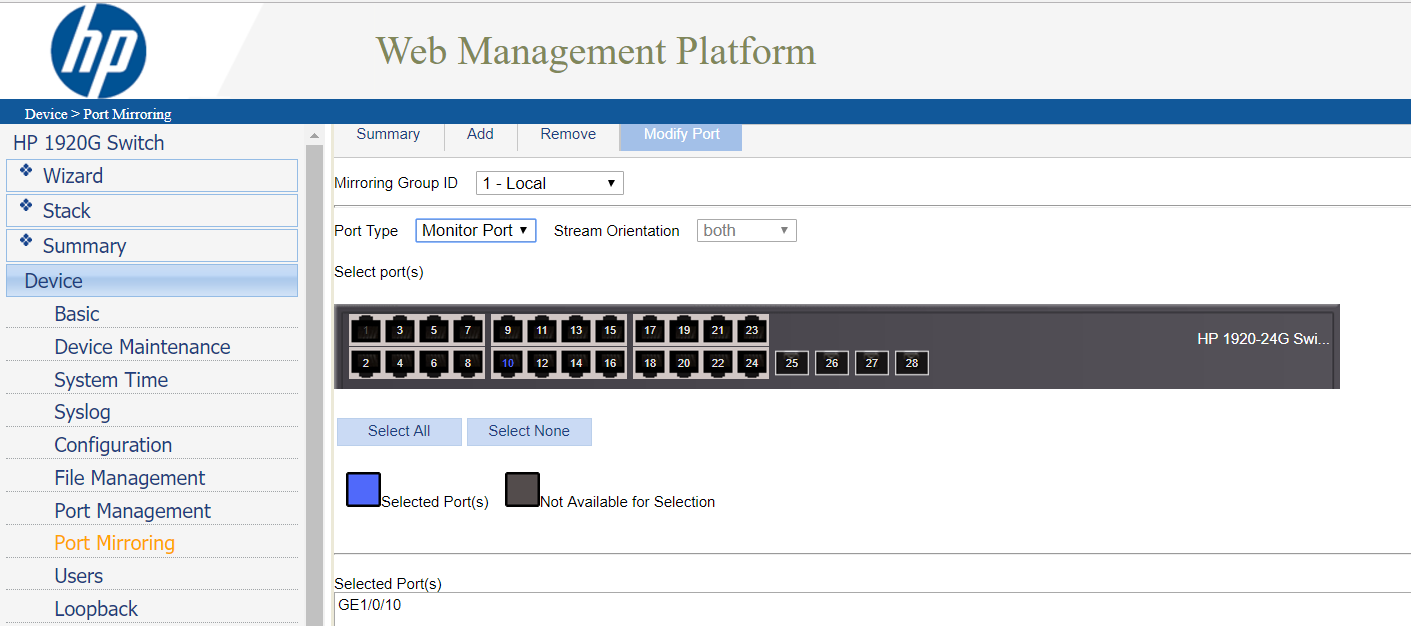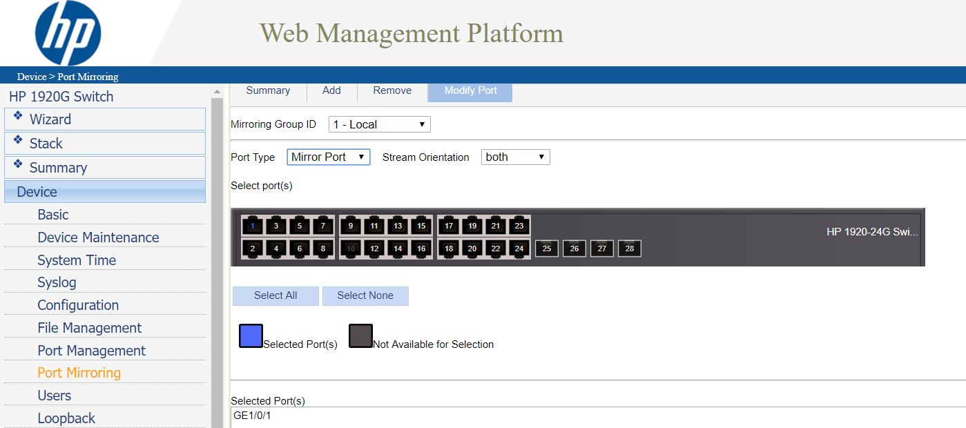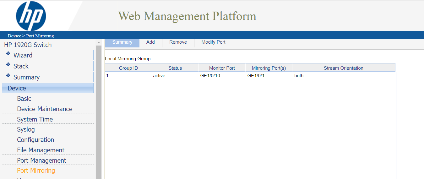 Luego de creado el "Mirroring Group" se pasa a la pestaña "Modify Port" y se agregan los puertos: